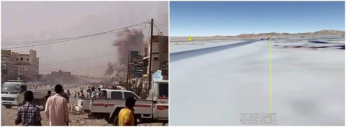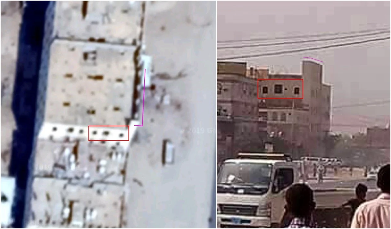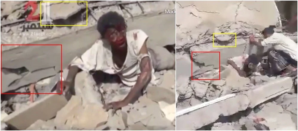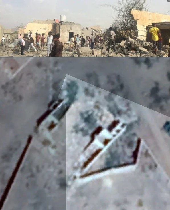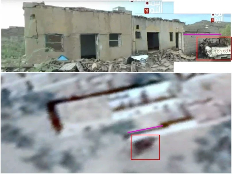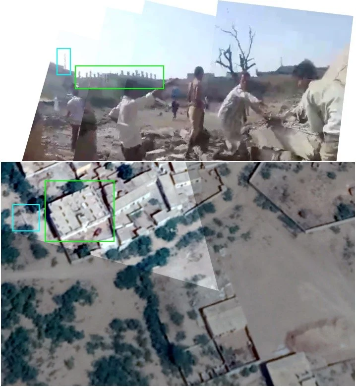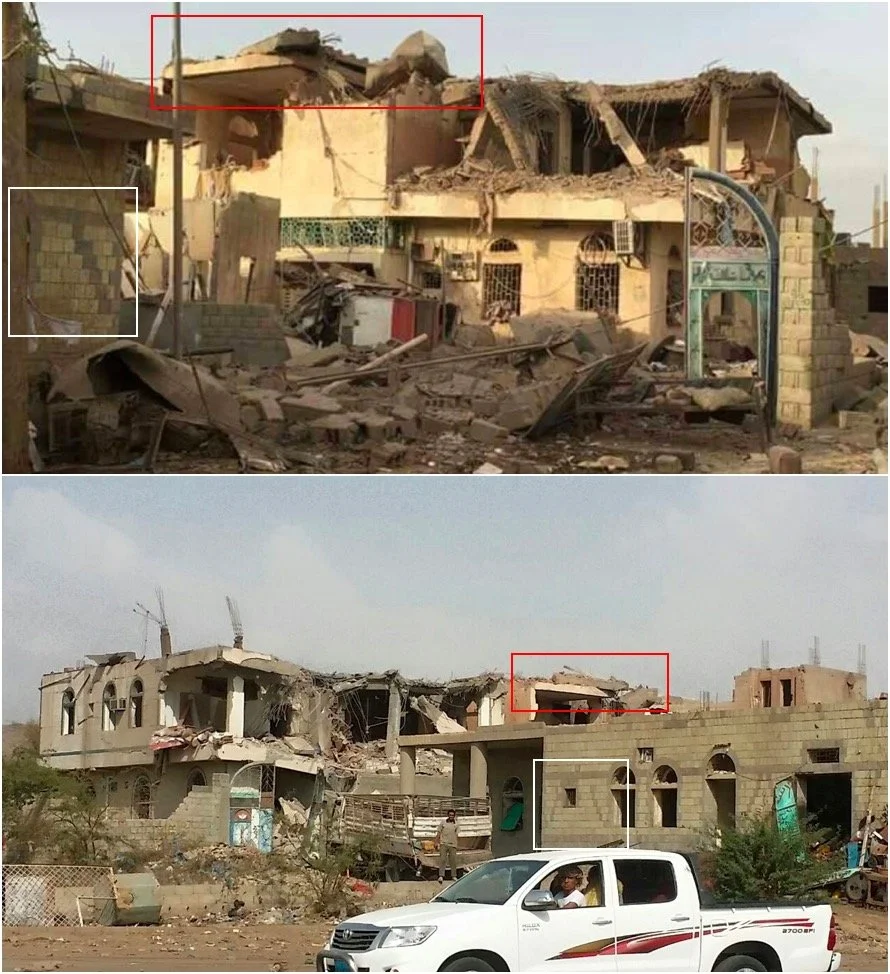 Top: video report from Yemen Today, Bottom: Satellite imagery of build adjacent to Building 1 taken on 2017/12/01 (courtesy of Google/DigitalGlobe)
