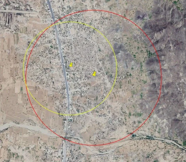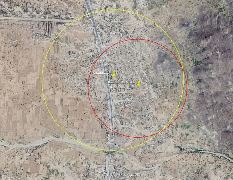 – The Joint Incidents Assessment Team (JIAT) stated it had targeted two weapon depots in Abs on 2015/05/13 that it claims were used by the Houthis. The JIAT also claimed that it did not target nor damage the Abs prison, and that the buildings it targeted were 900 meters and 1,300 meters away from the prison, respectively. We identified what we believe the SLC may believe is the prison in question.