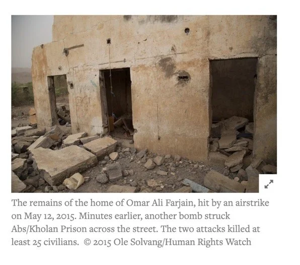 “Since the beginning of the war, several airstrikes in other parts of Abs targeted the military airport, a military compound, and another building off the main road that residents said was being used for military purposes.”