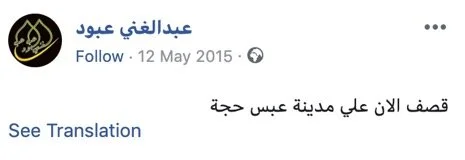 The earliest report posted to social media about an airstrike in Abs was a Facebook post made on 2015/05/12 at 1537 AST by this account. The post simply stated that there was bombing in the city of Abs “now”.
