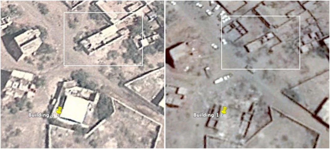 The buildings we identified as being the target of this strike appears to have been almost completely razed, and as such there is no imagery available showing the crater. However, the impact cloud we identified, and the level of damage at Building 1 and Building 2 indicate this was indeed an airstrike.