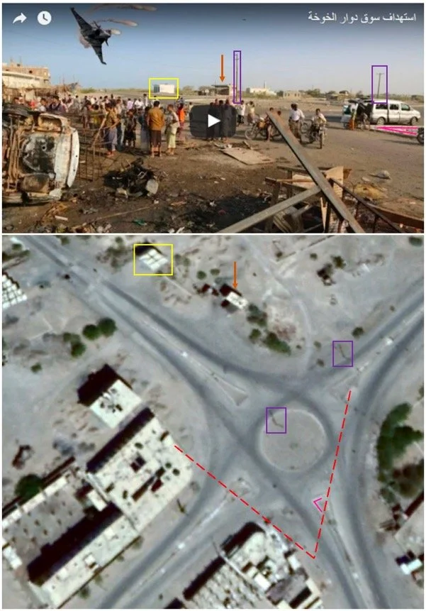 Multiple sources described the location as being market near a roundabout. We checked roundabouts in the city of Khokha and identified a potential location. This location was then confirmed using images and videos associated with this strike. This incident can be geolocated to 13.815485, 43.248501, primarily using a video posted by a YouTube channel named Alahvaz Media on 2017/03/12.