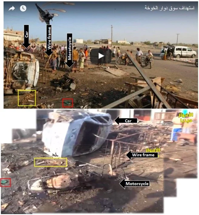 Although the open source information is relatively limited for incident, we can confidently establish the rough time, as well as the exact date and location of this incident. The open source images and videos depict many casualties, none of whom are wearing military uniform, and none of whom appear to have any kind of weaponry. Although there were reports of Houthi’s operating in the area, no obvious military structures or vehicles could be identified at the point of impact, although a large military camp does exist approximately one kilometer away.