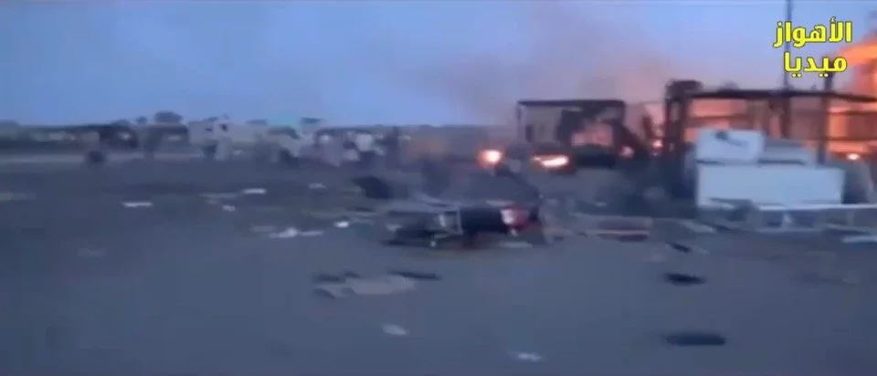 Despite the LCRD image above clearly having been edited to add a jet in the top left of the image, likely for dramatic effect, we can identify that both of these images were taken in the same location. The configuration of a burnt car, a wire frame and a motorcycle are identical, while debris such as a green sandel, marked in red, and a piece of cloth with a white object, marked in yellow, match exactly. This identical configuration of details strongly indicates the LCRD image and the footage in the Alahvaz Media video were taken in the same place at roughly the same time.