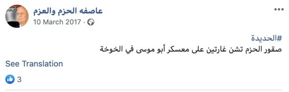 Facebook post reporting attack on “Abu Musa camp” at 1638 AST