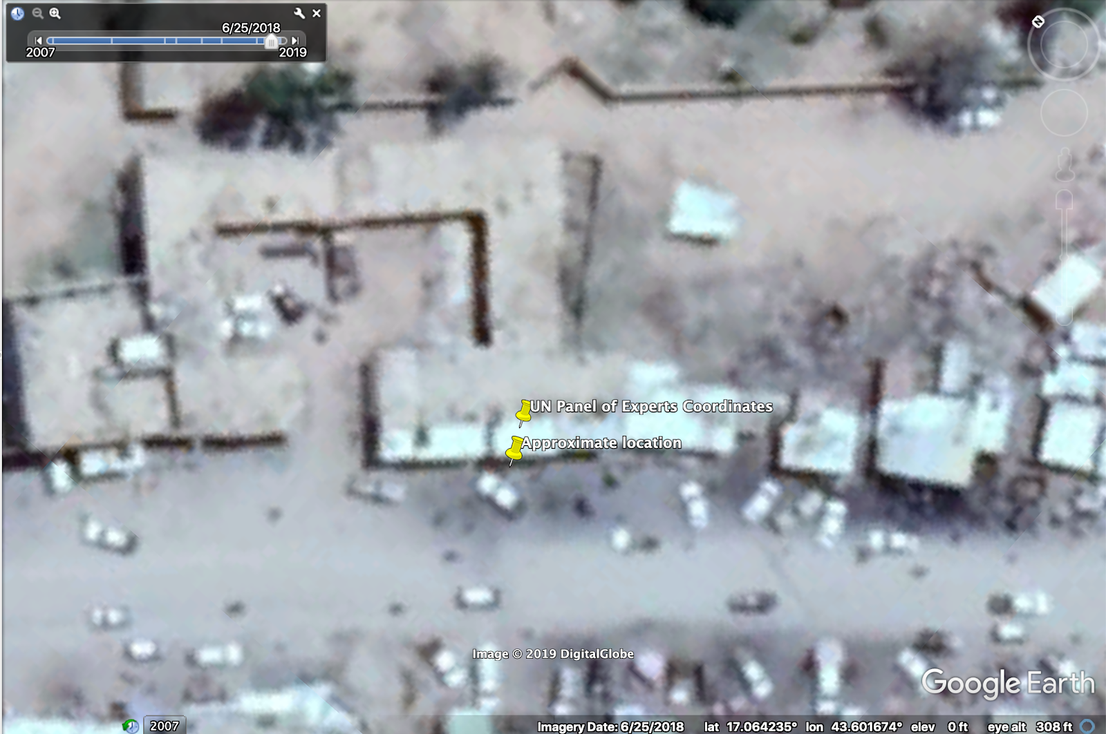 Screenshot of Google Earth imagery from June 25, 2018 showing the relative positions of locations for the incident assessed by the UN Panel of Experts on Yemen (“UN Panel of Experts Coordinates”) and this Researcher (courtesy of Google/DigitalGlobe).