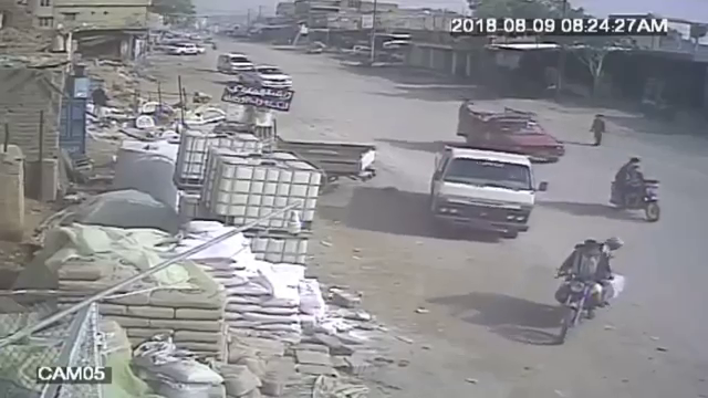 Only one armed man is apparent in video released from the scene of the strike and its near aftermath. A man armed with an AK-pattern rifle on his back is visible clearing human remains from the scene of the incident from 3:35 to 3:36 in the August 12, 2018 video. The presence of bright red uncoagulated blood in the vicinity of human remains at the scene suggests that the scene took place relatively close to the time of the incident. He is again visible in a subsequent scene from 3:46 to 3:55 without a rifle on his back.