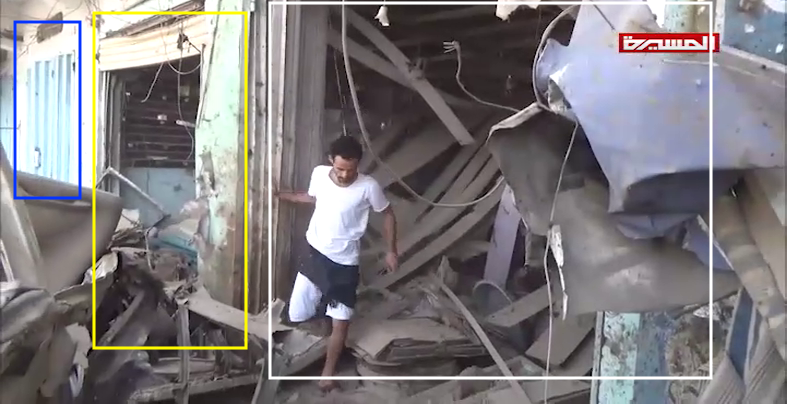 A review of satellite imagery from both before and after the Dahyan incident shows the awning and roof structures above the affected market stalls damaged, consistent with videos published showing the the scene of strike.