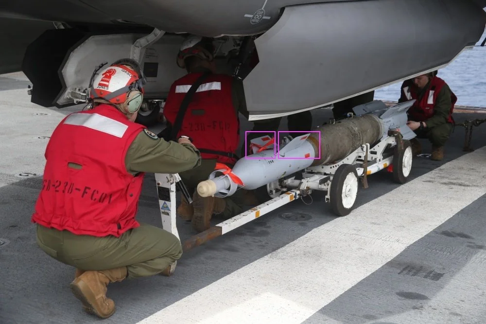 Location of guidance fins on a GBU-12 Paveway II in a reference image of the munition being loaded onto an F-35B by US. Marine Fighter Attack Squadron 121, 31st Marine Expeditionary Unit.
