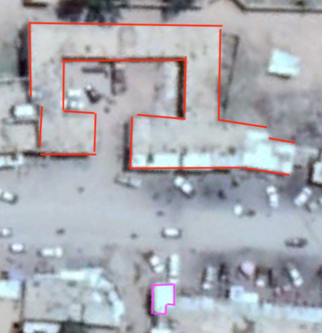 Screenshot of Google Earth satellite imagery with corresponding highlights of the affected building complex in red (courtesy of Google/DigitalGlobe)