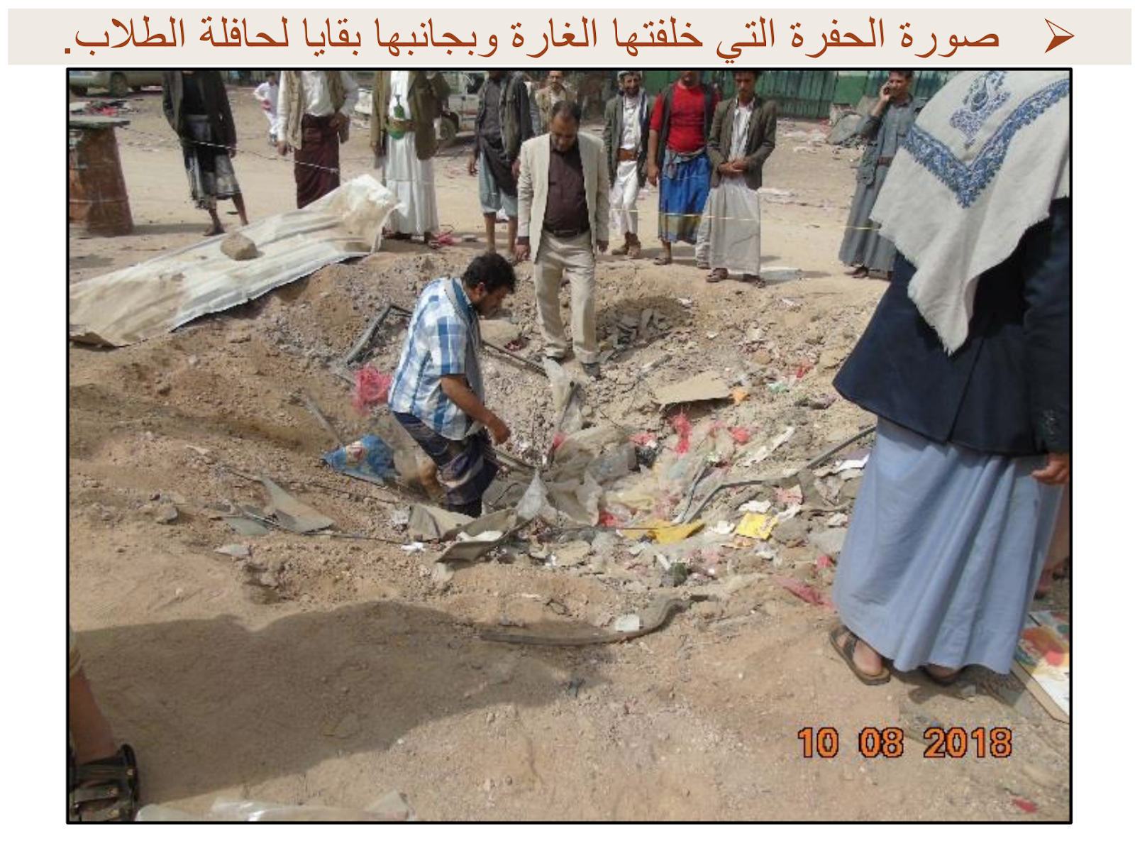 The Houthi Ministry of Education published a list on August 18, 2018 with what it claimed were the names of 38 people killed in the strike and 55 wounded, four of whom were allegedly adult teachers and 34 of whom were children. The ages of the children on the list range from nine to 15 years old. The UN Panel of Experts report cited and consulted a forensic pathologist who noted “clear and straightforward evidence of injuries from an explosion involving both living and dead children.” The panel said it was neither able to independently verify the “media and humanitarian organizations” reports” which assessed “[a]pproximately 43 killed and 63 wounded, the majority of whom were children,” in the incident nor the list of dead and wounded published by the Houthi Ministry of Education.