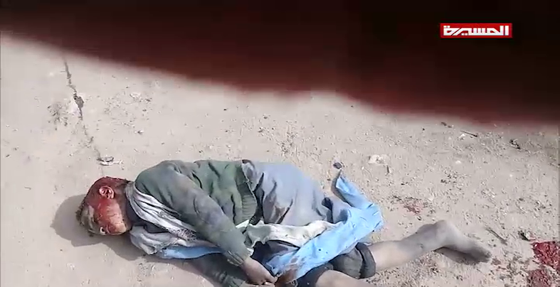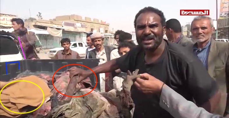 Zaid Tayyib also appeared in the Al Jazeera documentary and claimed to have put his children on the bus in the early morning. “I was 150 meters away from the bus. Id’ dropped my children, given them some stuff, put them on the bus and left. They waved goodbye.” Tayyib also noticed the presence of military aircraft overhead when he put his children on the bus in the morning. “I saw reconnaissance aircraft, backed by war planes, hovering over the area.” When the strike took place later, Tayyib said he discovered the bodies of two of his sons Ahmed and Yousef at the scene, but was unable to find his son, Ali, and assumed “[h]is body was probably torn to pieces.” Their names appear in on both the Houthi Ministry of Education and Ansarollah.com list of the dead and wounded.