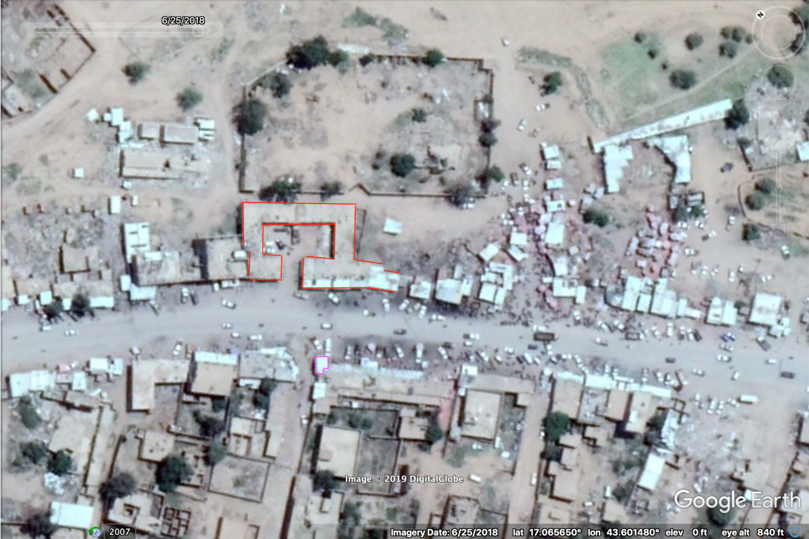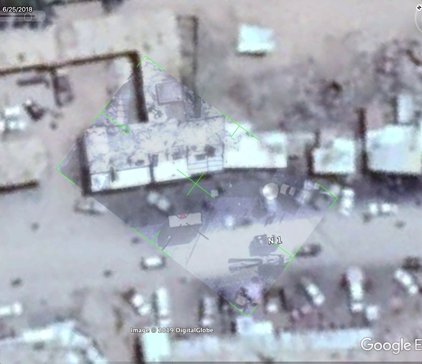 Overlay of the Arab News photo on top of Google Earth imagery of the location of the Dahyan incident conducted by the Researcher with varying levels of transparency on the Arab News image. The Arab News image was taken at a different angle than the Google Earth June 25, 2018 image and Researcher corrected it to account for the difference in angles. (satellite image courtesy of Google/DigitalGlobe)