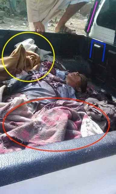 Another account, @34164eebe92f4c8, tweeted a photo at 0938 AST bearing no Houthi media outlet or news organization logo showing children’s corpses in the back of a white and black pickup truck’s flatbed. The photo appears to be among the earliest pieces of visual evidence on Twitter concluding that a strike had taken place. The black pipe frame surrounding the back of the truck cab, the ridges in the flatbed, the red and black patterned and tan blankets match the flatbed of a pickup truck in the Al Masirah video taken on August 9. The same truck, child’s corpse, and blankets are visible in a video taken at the scene of the incident and subsequently published by Al Masirah. This establishes that the @34164eebe92f4c8 photo was taken at or near the scene of the Dahyan incident at 0938 AST at the latest.