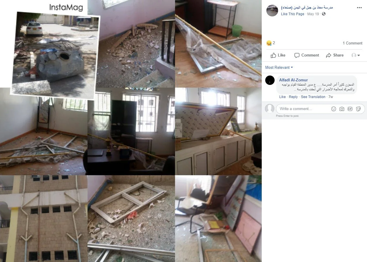 A post on the Moaz bin Jabal Boy’s School Facebook page showing shattered glass and other damage at the school, which is located directly across the street from the site of the airstrike