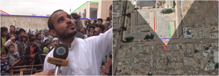 A video that captured the moment of the airstrike also allows for an estimation of the time of the event. In the video, a mosque’s dome and minaret are casting shadows onto its roof. These shadows are cast towards the left side of the frame, indicating that the sun was located on the right side of the frame. Since the airstrikes happened in the morning, the sun would have been in the east. This means that the person filming the scene was looking north towards the site of the airstrike.