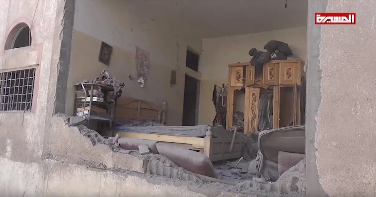 A still from an Al Masirah video showing a partially-collapsed wall in a building adjacent to the one that was destroyed, exposing a stairwell