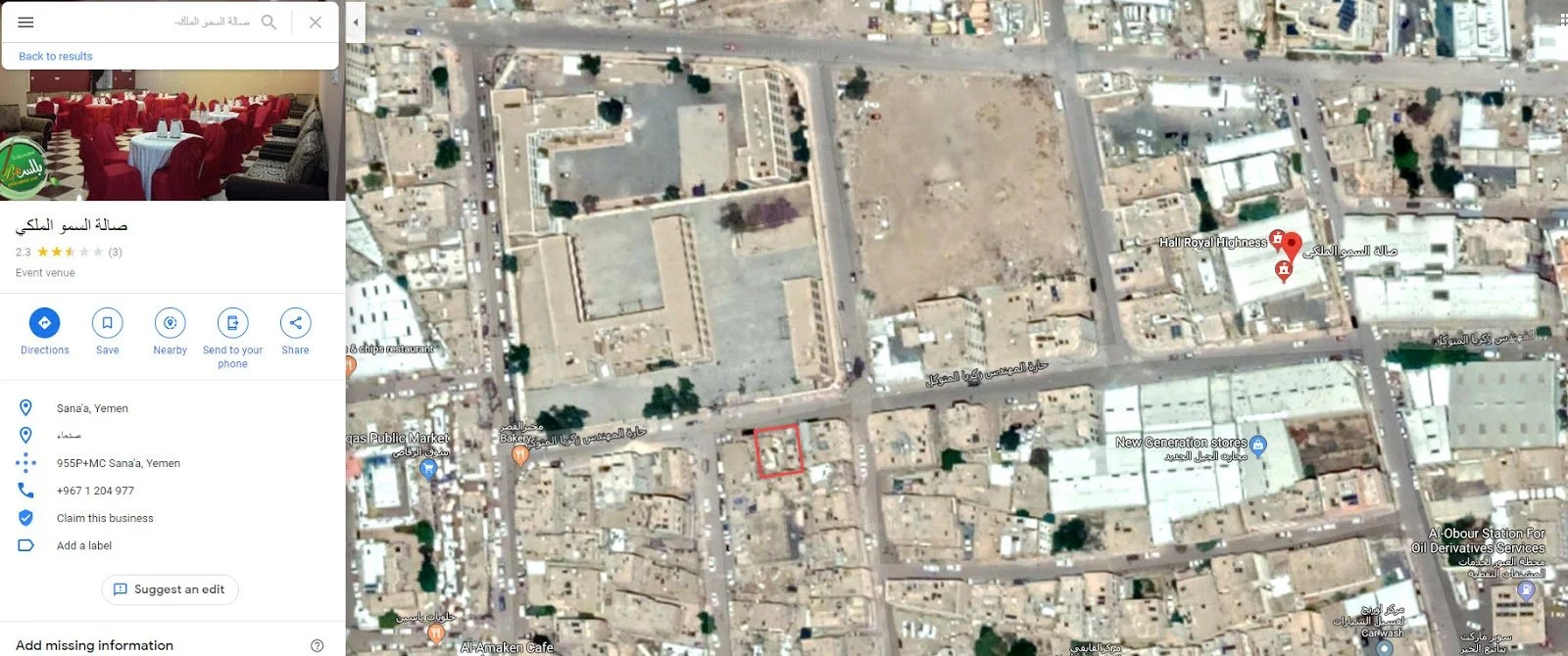 The red sign on the right side of the CCTV footage reads “صالة السمو الملكي”. When searched on Google Maps, this name yields a restaurant that is located approximately 180 meters east of the site of the airstrike: