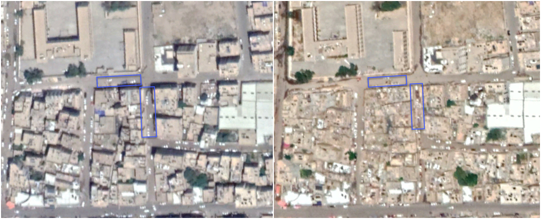 Left: a satellite image of the site from 2019/04/25; Right: a satellite image of the site from 2019/05/17. Note that in the earlier image, the streets in the blue boxes are clear, while in the later image there appear to be objects present (Courtesy of Google/Digital Globe)