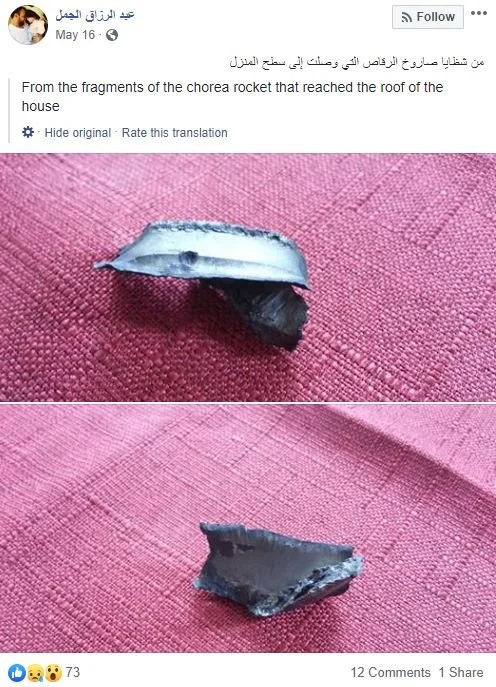 Two mentions of munition remnants related to this strike were found on Facebook. A user shared two images of what appear to be metal fragments, which he claims came from the munition that caused the explosion. A second Facebook post was found, containing an image of an object that the user claims “came down on us in the bombing”.