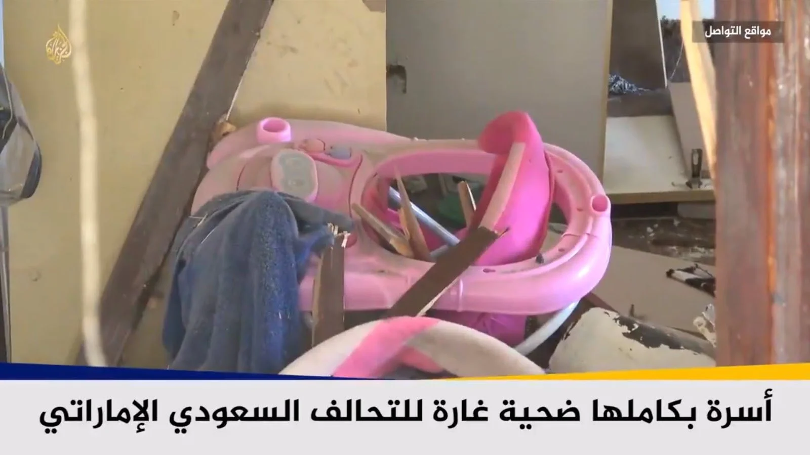 A still from an Al Jazeera video recorded at the site showing a baby seat in the rubble