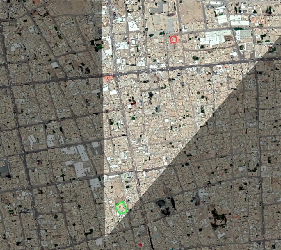 The intersection of Hayel (running top-bottom) and Raqas (running left-right) streets in the blue box, while the building complex with the long walls is in the green box (Courtesy of Google/Maxar Technologies)