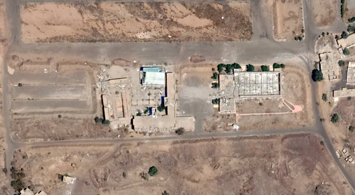 Two of the buildings inside what Wikimapia identifies as a military base, approximately 1,300 meters north of the site of the airstrike. Note the damage to the buildings as they appeared on 2019/03/03 (Courtesy Google/Maxar Technologies)