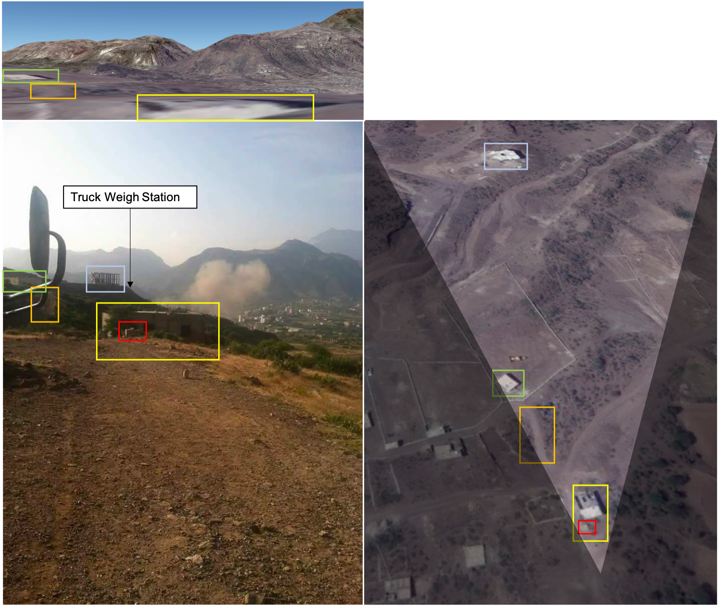 We can further narrow down the location by examining the image below, which is taken from a Yemeni Press report on the incident. It is clearly the same bus at the same location depicted in other images and videos of the event. This image also shows the horizon in the background, with a distinctive ridge-line. Using a trial-and-error process on Google Earth Pro and its landscape function, we can check the three roads that enter Hoban and identify that only one location, near a truck weigh station south-west of Hoban, appears to match the configuration of this ridge-line. It should be noted the right hand edge of this ridge-line is mostly obscured by vegetation in this image.