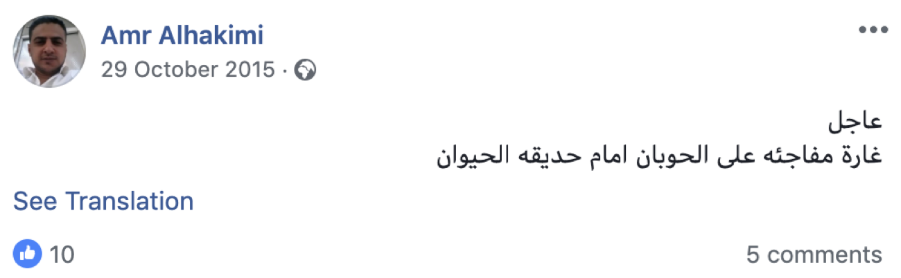 We used Twitter advanced search and WhoPostedWhat.com to search for posts on Twitter and Facebook containing certain keywords, such as “Hoban” or “airstrike” made on 2015-10-29 in both English and Arabic. The earliest post we found which appeared to reference this incident was made by Amr Alhakimi, an activist who claims to live in Taiz. At 0756 AST he posted that a “sudden raid” had taken place in front of Hoban Zoo, which is approximately 100M to the north-west of the location identified as the site of this incident.