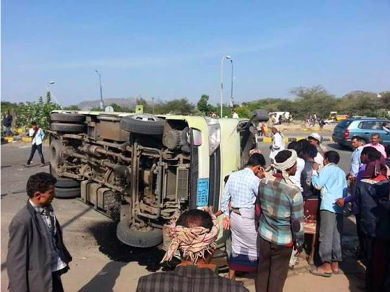 The open source information we have collected and analysed indicates that on the morning of 2015-10-29 a bus was hit by an explosion next to the truck weigh station outside Al Hoban. None of the open source information reviewed indicates that any of the individuals on the bus were military personnel. Multiple posts and news reports claimed that this was an airstrike, including posts that appear to have been made immediately after this incident took place. Although the exact point of impact or target could not be established, multiple reports indicate that Houthi’s were active in this area at the time.