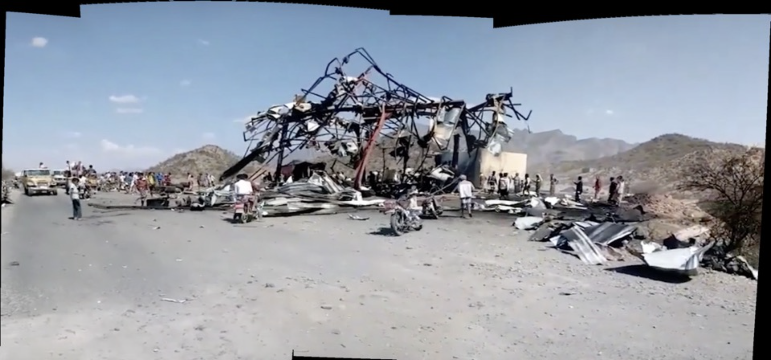 Composite panorama of the Ansar Allah video. The fuel station can be seen on the left, and the bodies seen in multiple images and videos of this incident are on the right.