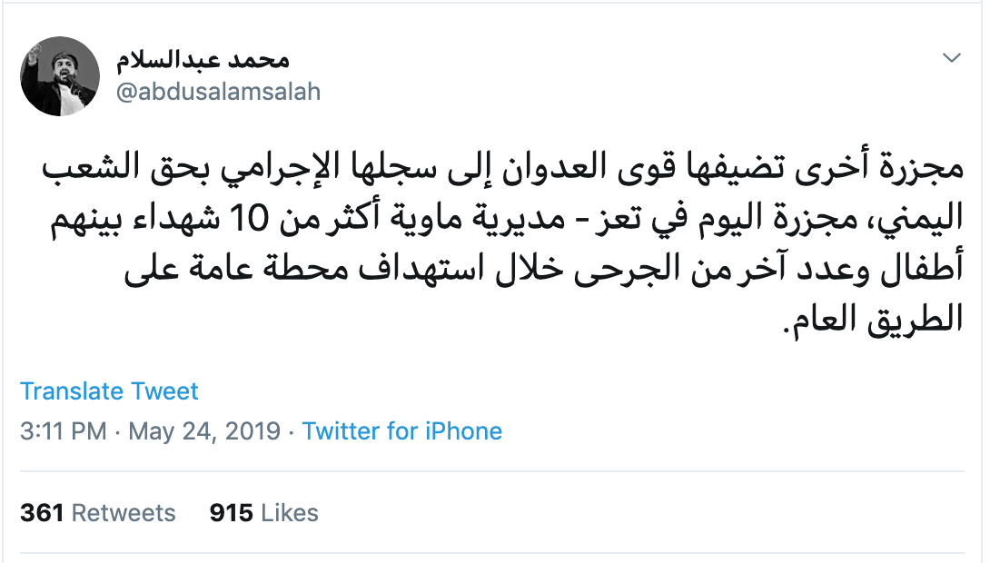 A spokesman for the Houthi, Mohammad Abdulsalam, wrote this tweet on the day of the incident condemning what had happened and claiming to add it to the criminal record of the aggression against the Yemeni people: