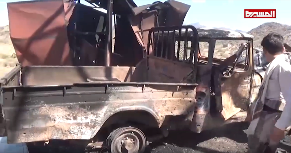 Possible destroyed vehicle to the right of a still from the Al Masirah footage. The destroyed truck can be seen to the left of this still